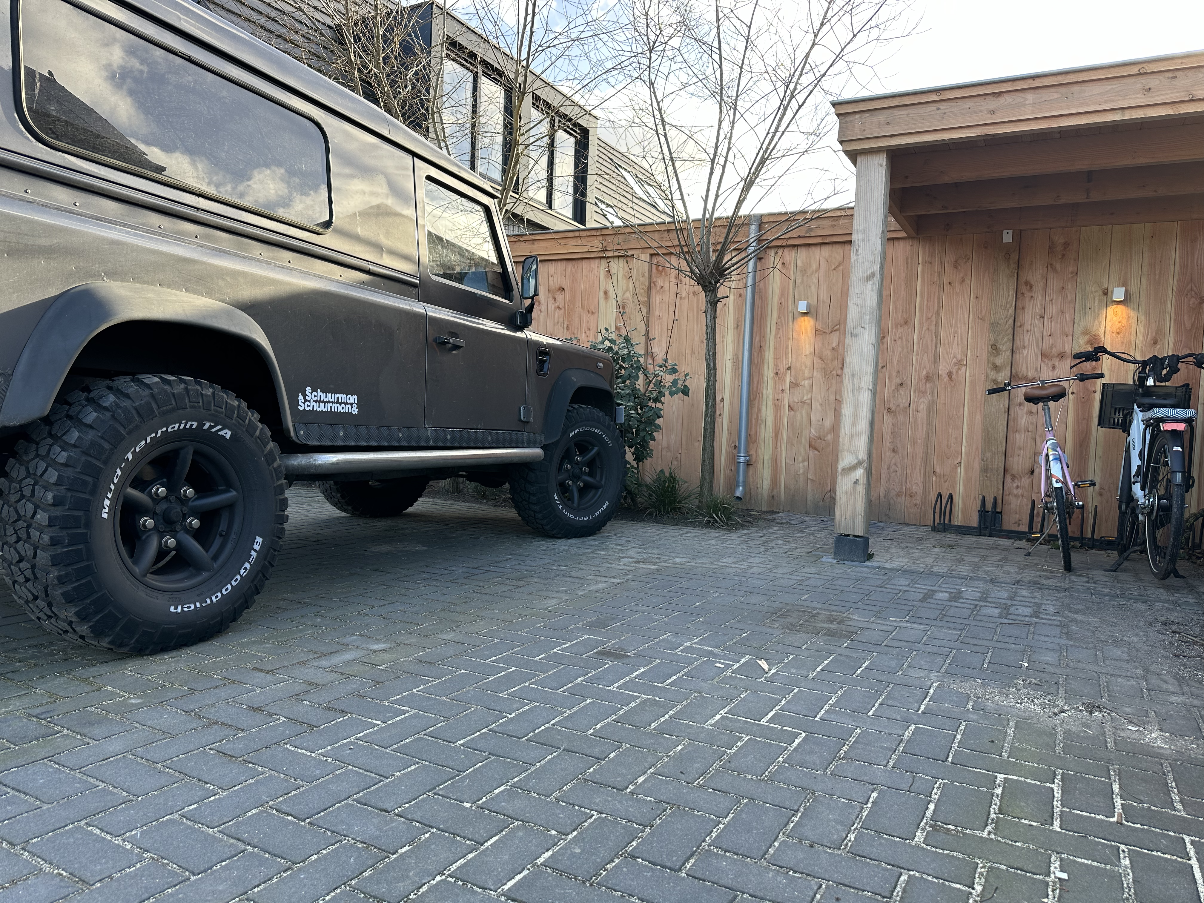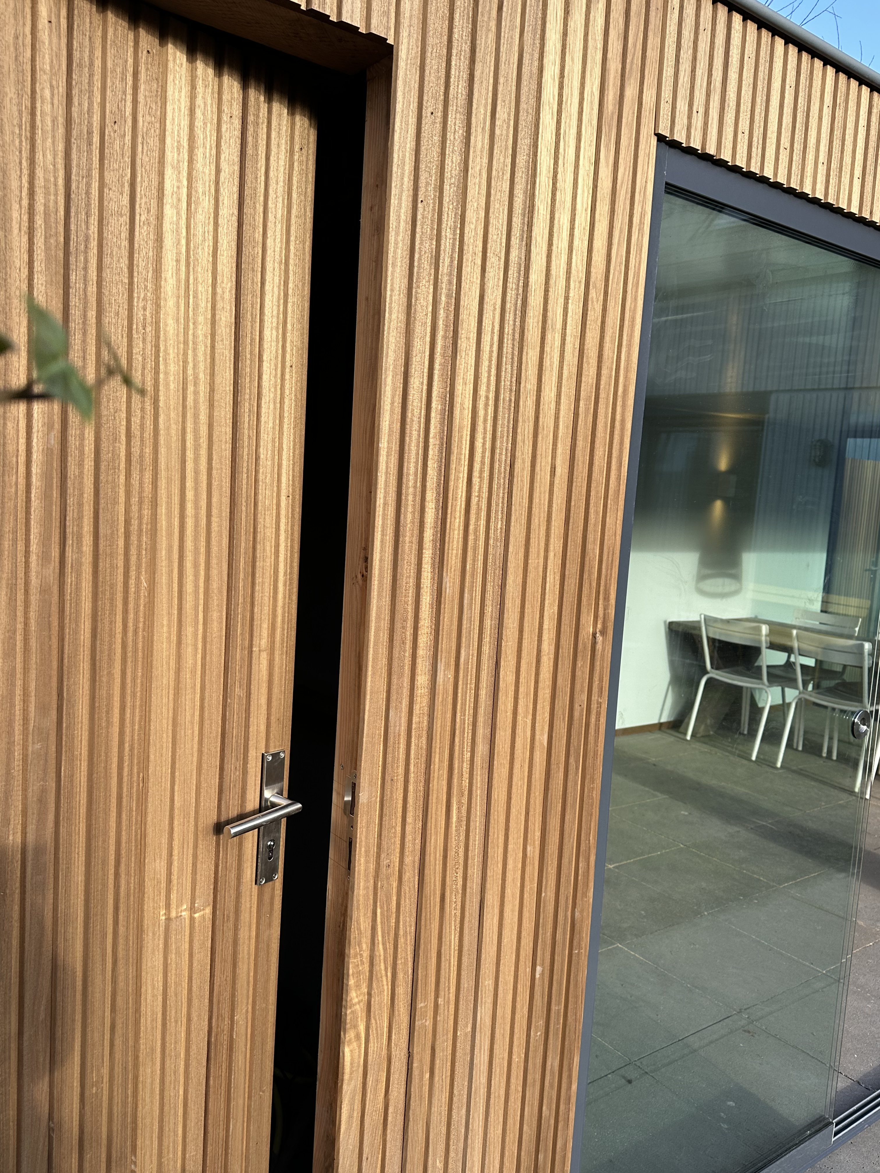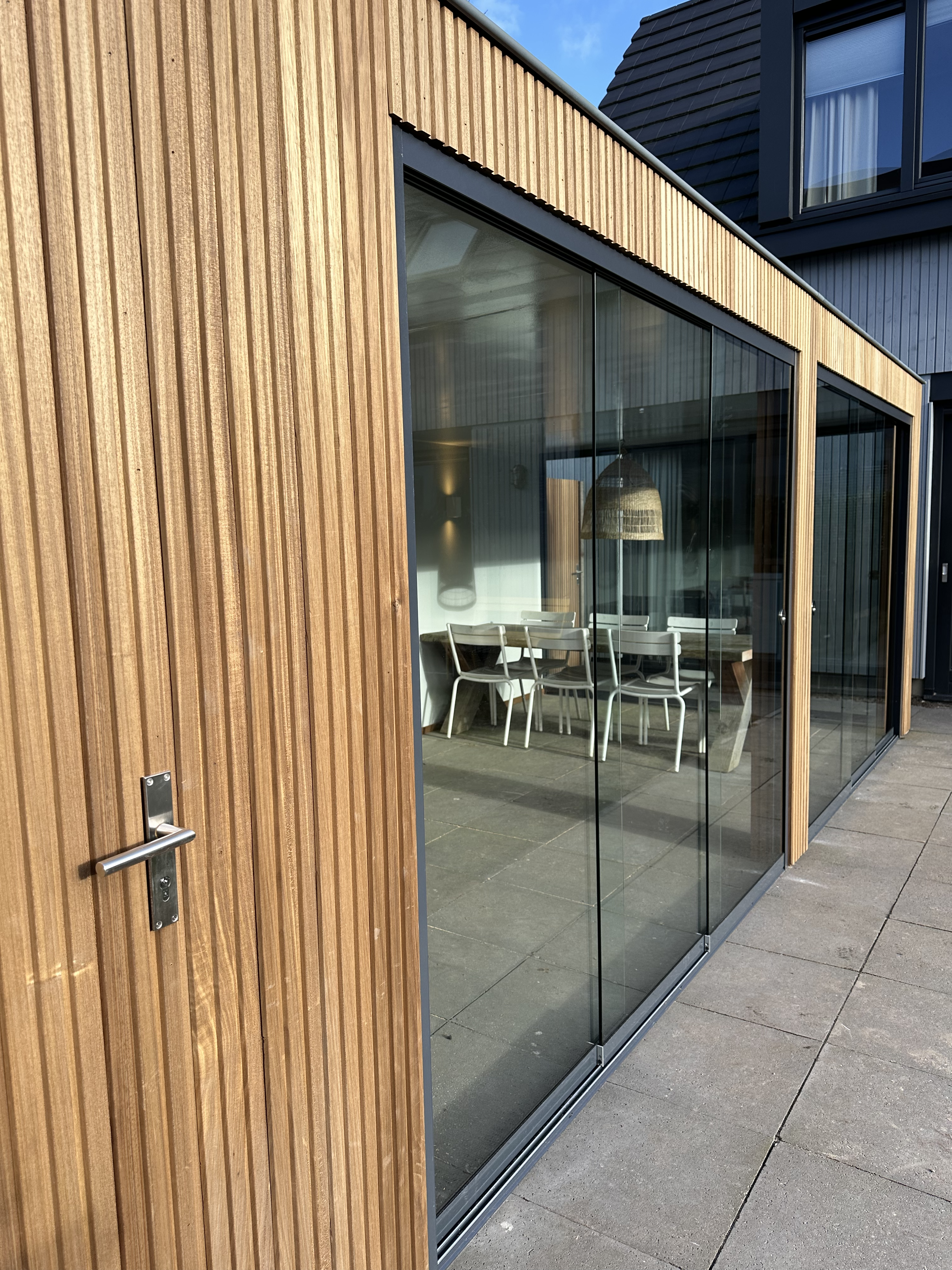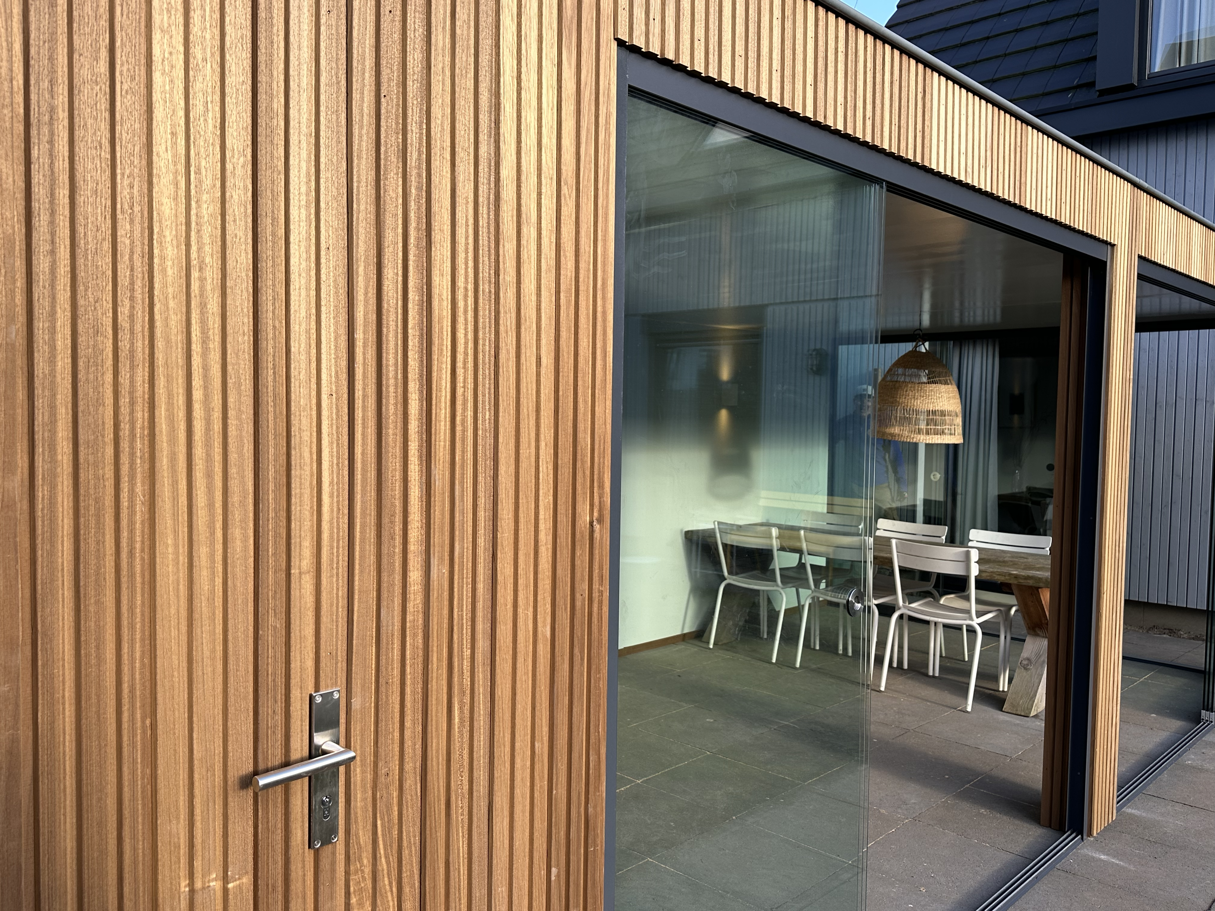 Ayous hout heeft een warme uitstraling en voegt een vleugje rustieke charme toe aan uw buitenruimte. De combinatie met een glazen schuifpui creëert een harmonieus geheel dat perfect past bij de omringende natuurlijke omgeving.